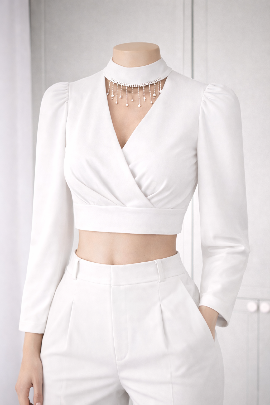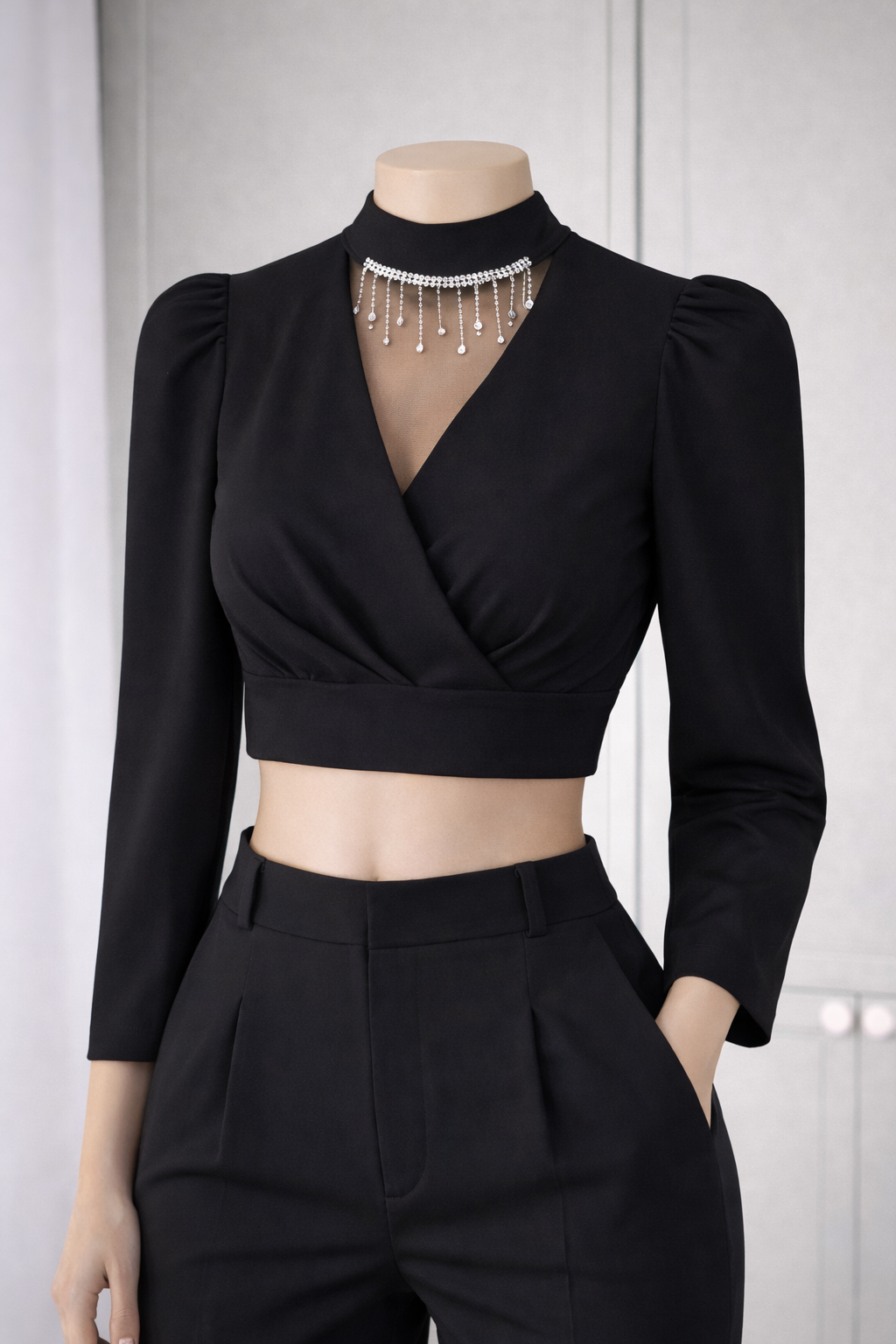 جنس پارچه کراپ دالقیچ است و کشسانی دارد قد کراپ حدود ۴۵ سانتی متر است کمربند از جنس پارچه دارد سنگ دوزی یقه کراپ دست دوزی شده است